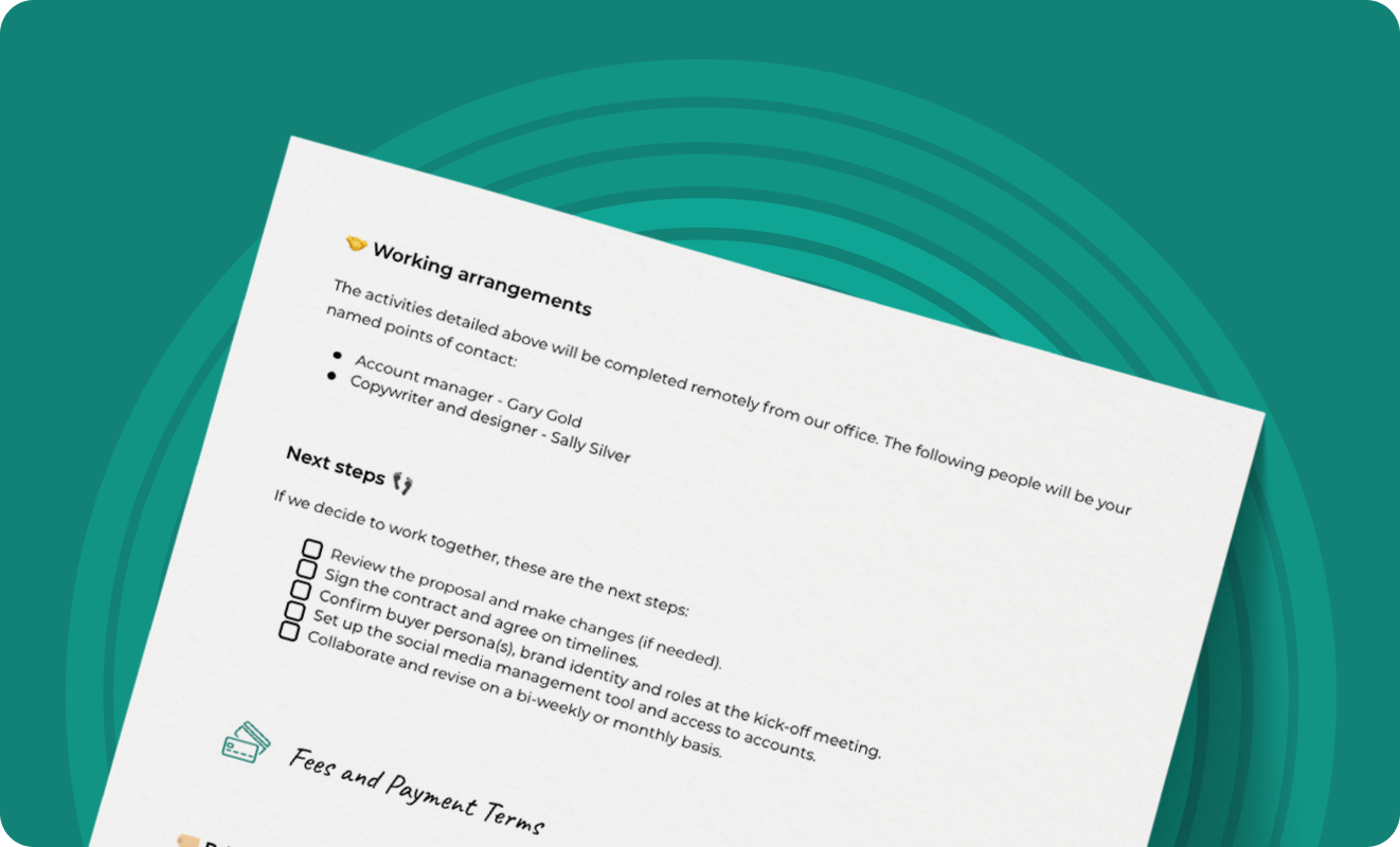 Ensure a smooth transition from prospect to partner by outlining clear Next Steps. This includes reviewing and signing the contract, confirming buyer personas, setting up the social media management tool, and establishing a regular collaboration cadence.